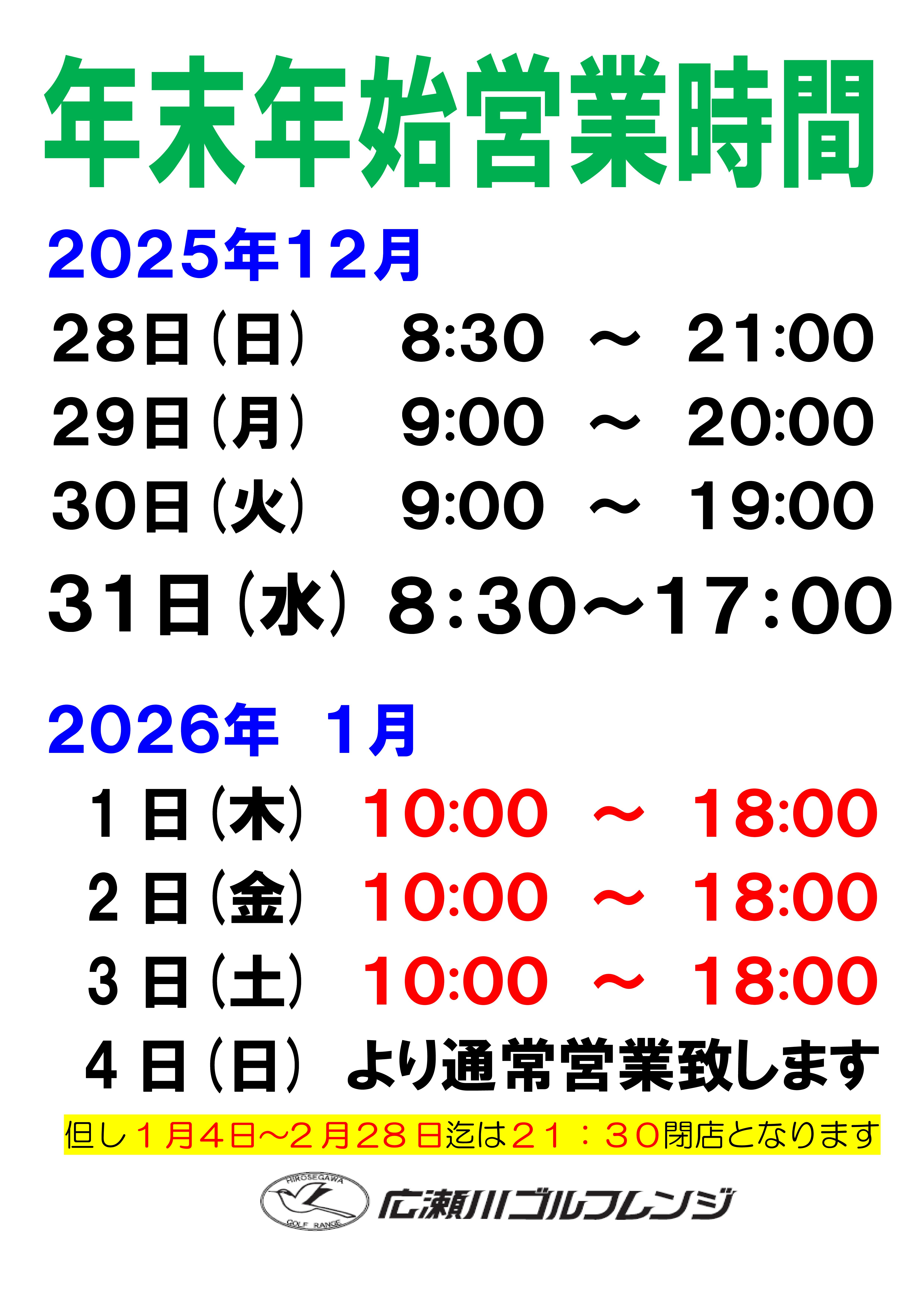 年末年始の営業時間